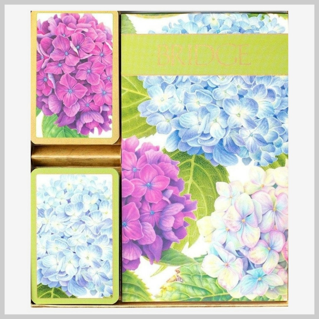 Bridge is a card game of advanced skill, which has origins dating back to the 19th and 20 centuries. Designed for group play, this game is played by four people in two pairs. A lovely accent for any room, bridge encourages conversation and friendly competition among new and old friends. Our beautiful Bridge Gift Sets feature artwork and designs created by artist and sourced from museums around the world. A perfect hostess, housewarming, or holiday gift, each set includes two sets of standard 52 card playing decks and two 39-page bridge score pads in coordinating designs. Each of the two card decks features a slightly different, but coordinating design. The entire set is packaged in a gold gift box making it easy to give.