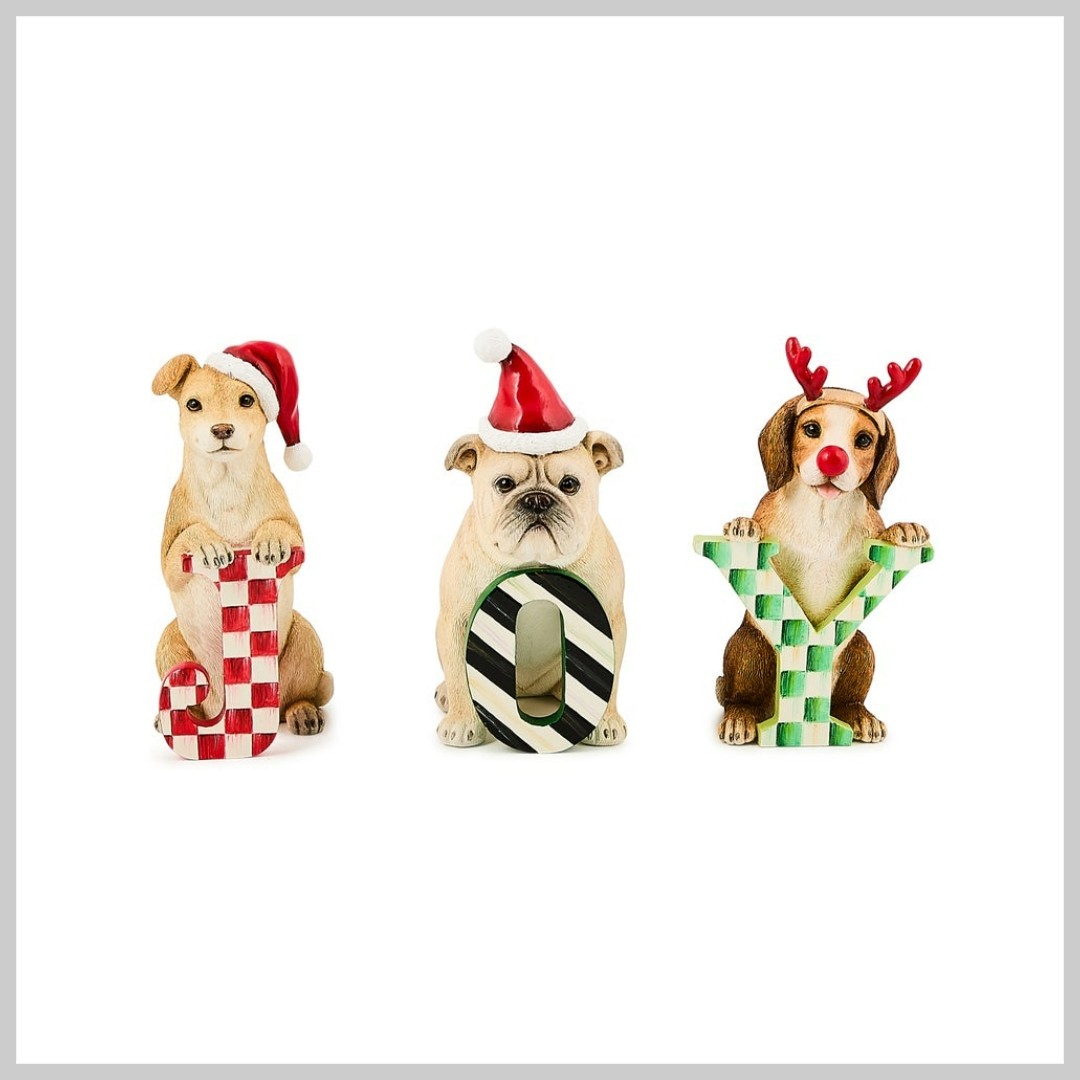 Add MacKenzie-Childs signature charm to your Christmas season with the Check It Out JOY Dog Figurine Set. The perfect gift for dog lovers, each precious pooch wears a winter holiday hat and holds a letter decked out in Christmas color and pattern. Beautiful on an end table or mantel alongside your stockings for a cheerful holiday display.
