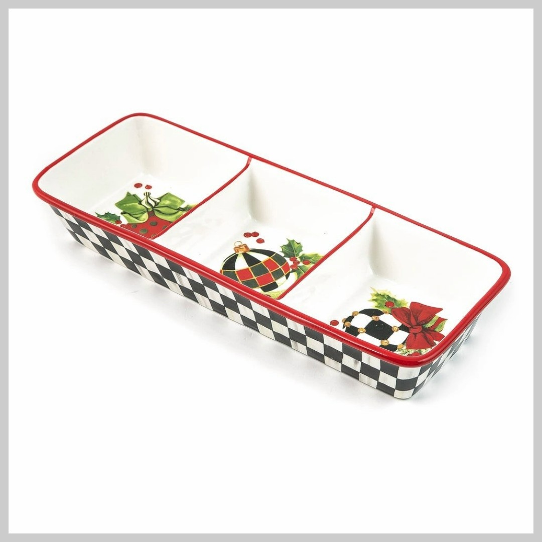 This divided ceramic serving piece makes a playful presentation of garnishes, candies, or bar snacks. It’s decorated with an enameled coating of our Deck the Halls pattern on the inside and checks on the outside.