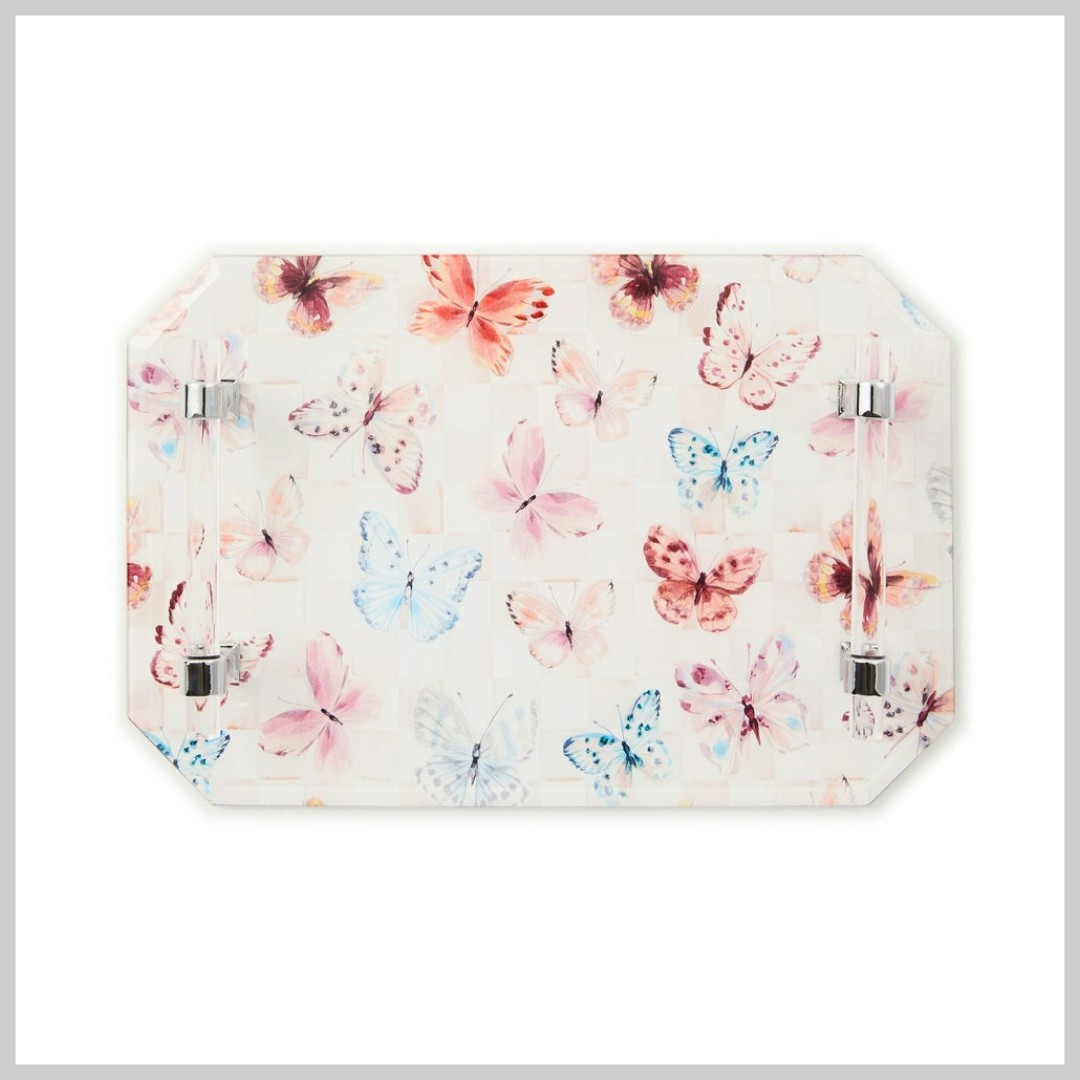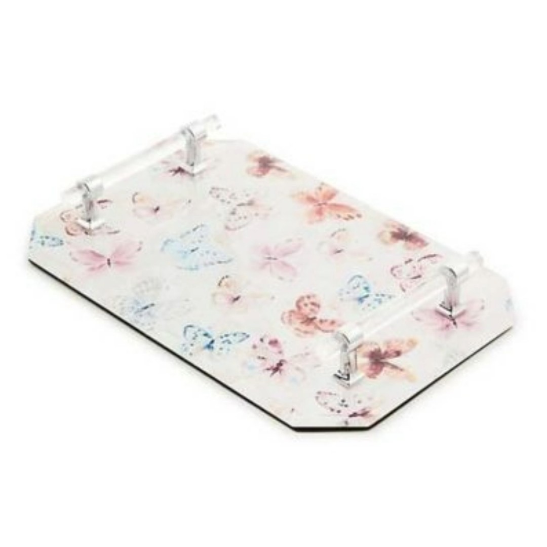 Display with delight on this pretty and practical jewelry tray that features a print of butterflies and pink checks under glass. It’s trimmed with sleek acrylic handles.
