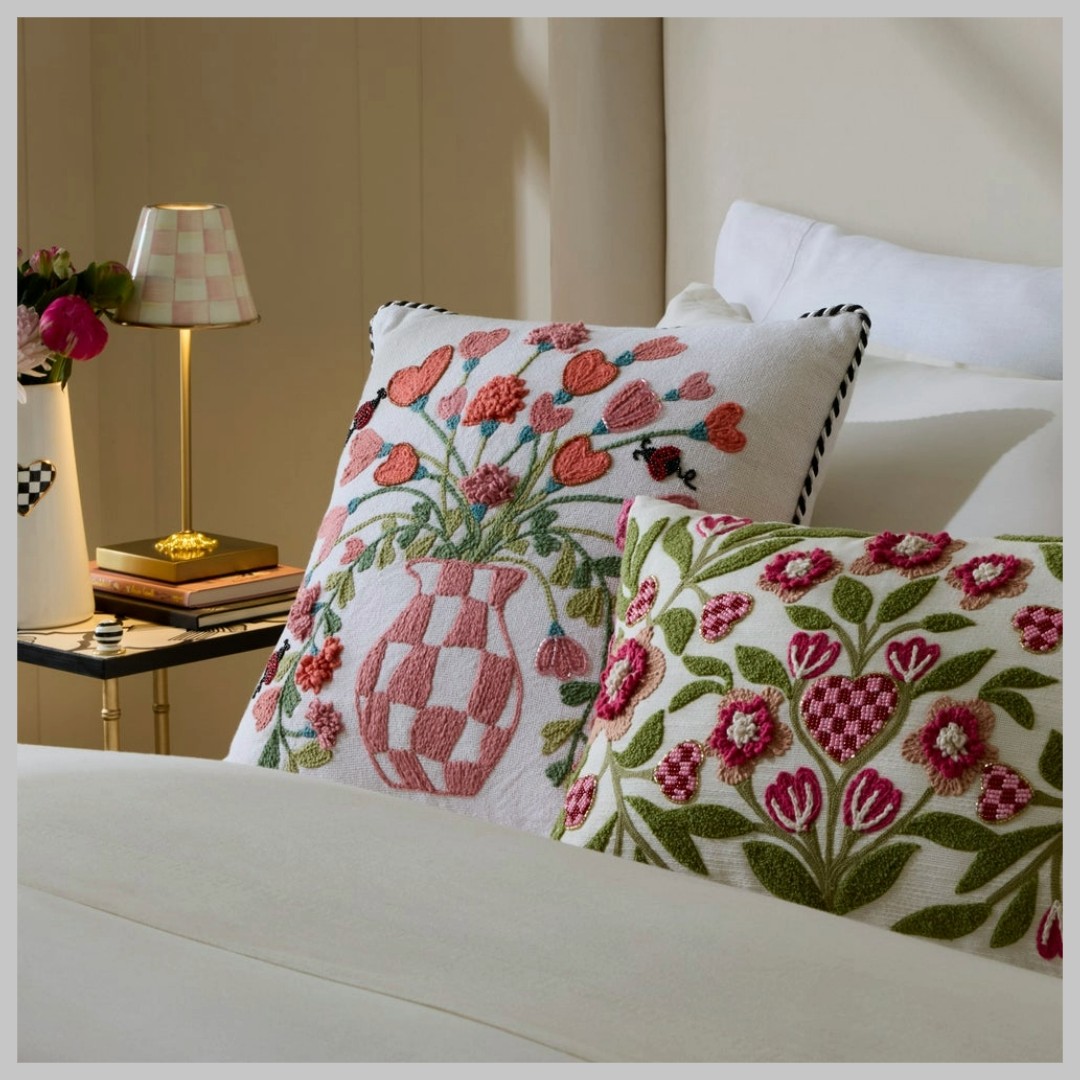 Make a sofa style statement with this lovely Pink Check Hearts Bouquet Throw Pillow. Features a textured design with a floral and hearts bouquet in an abstracted pink and white check vase.