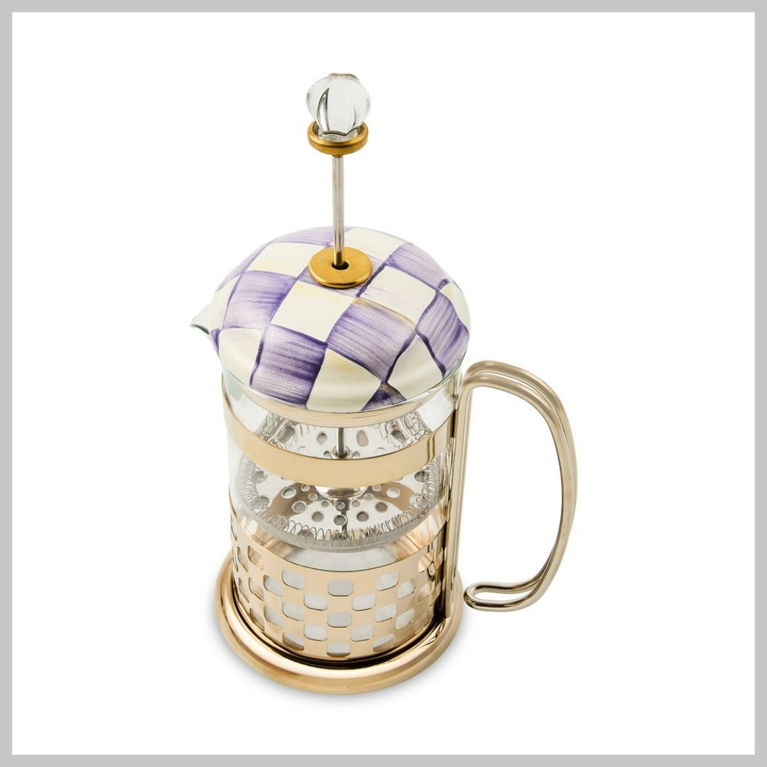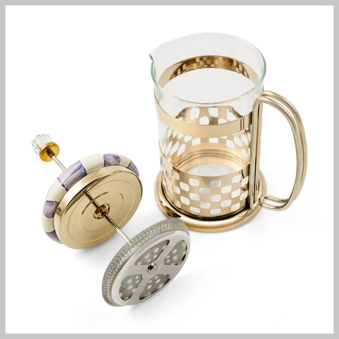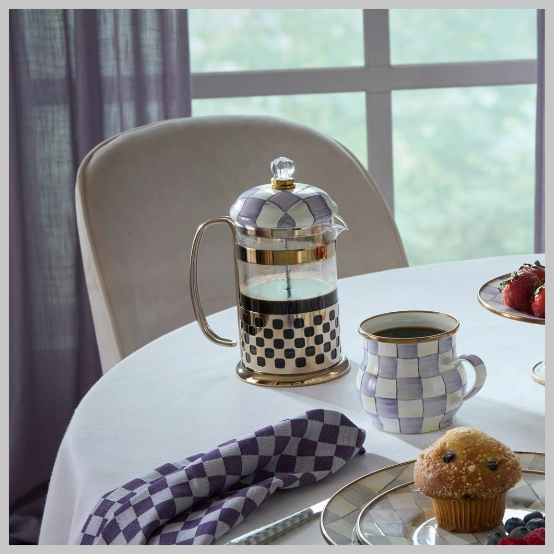 Wake up and smell the coffee made in our Violet Check French Press. The plunger-style brewing method results in 32 ounces of fresh French press coffee, which is revered for its rich, full-bodied character. The glass container is topped with an enamel lid, hand-painted with our Violet Check pattern, and sits in a bronze-finish metal base, accented with our logo and a handle.