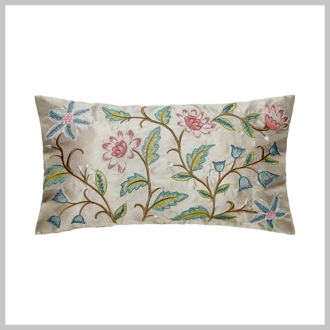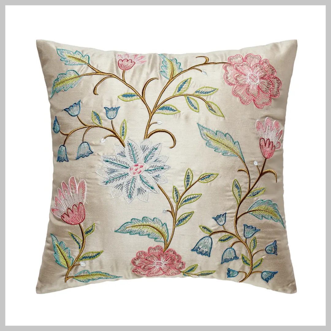 Embroidered taupe faux silk throw pillow with included insert